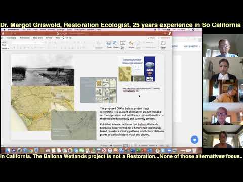 You'll meet proponents of Ballona Wetlands Ecological Reserves restoration to a predominantly Freshwater, Seasonal Wetland. We advocate for the return of indigenous people to Ballona, an abundance of wildlife, plant life, fungi, saving wetland soil, and vehemently oppose industrial scale bulldozing. As you watch these videos you will see what a true restoration can offer all of us. These video presentations are to large groups of public citizens, Stakeholders, the California Coastal Commission, the California Department of Fish and Wildlife, the Santa Monica Bay Restoration Commission, the Santa Monica Groundwater Sustainability Plan, Democratic Clubs, West Basin Water District, Army Corp of Engineers, California Coastal Conservancy and other agencies and NGOs.