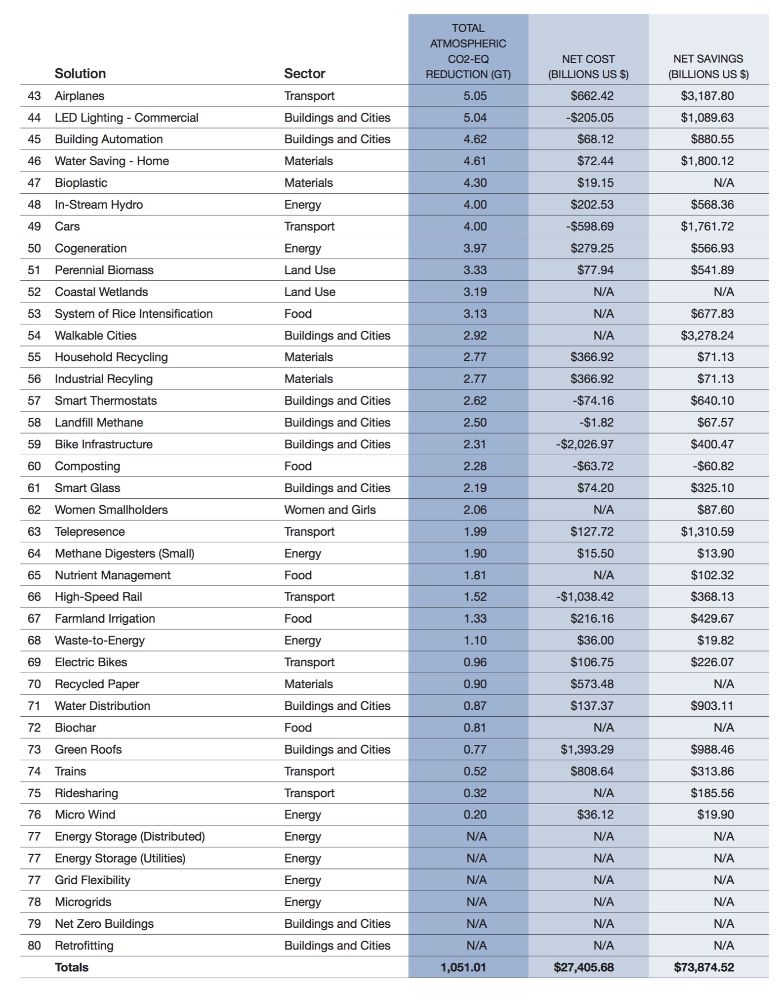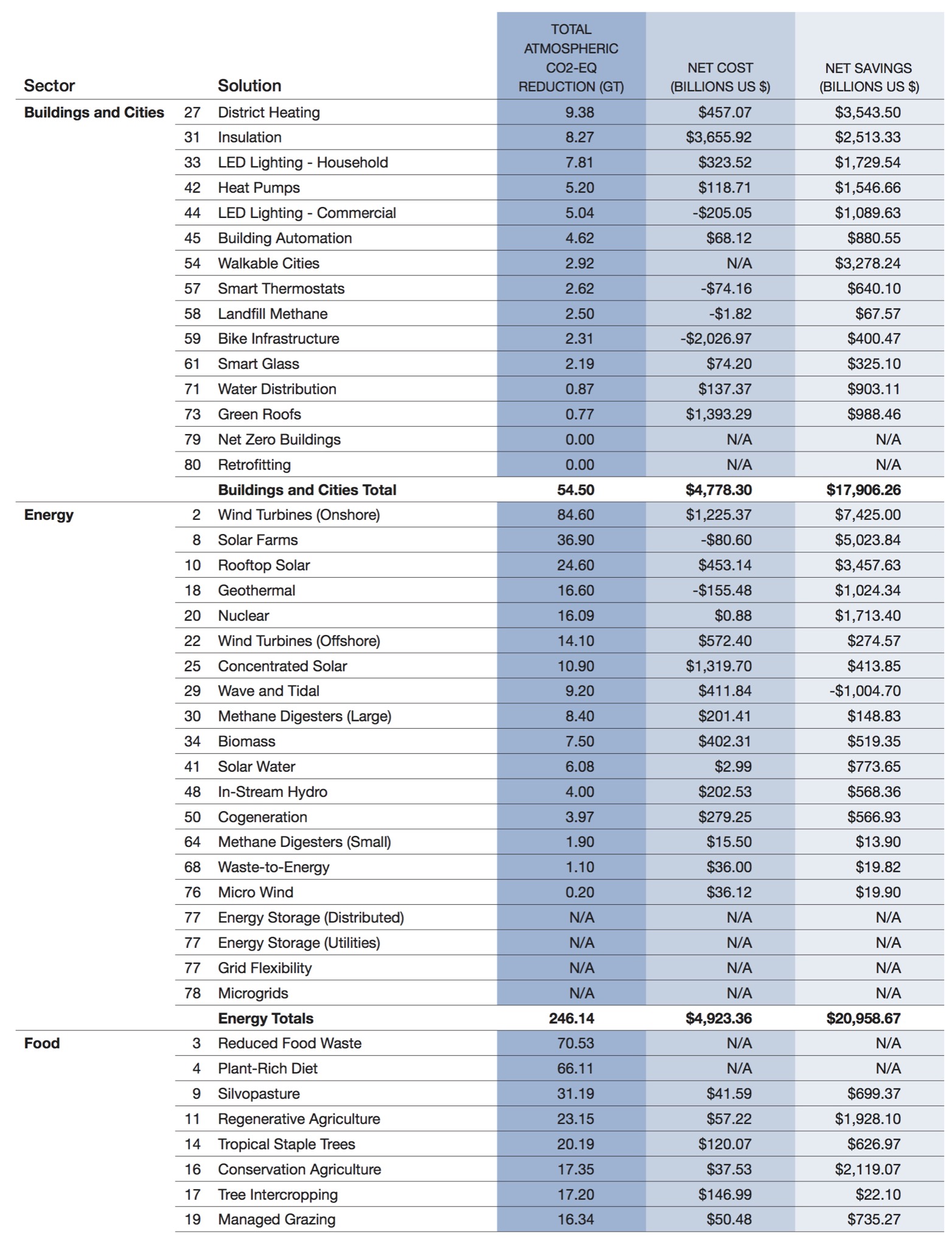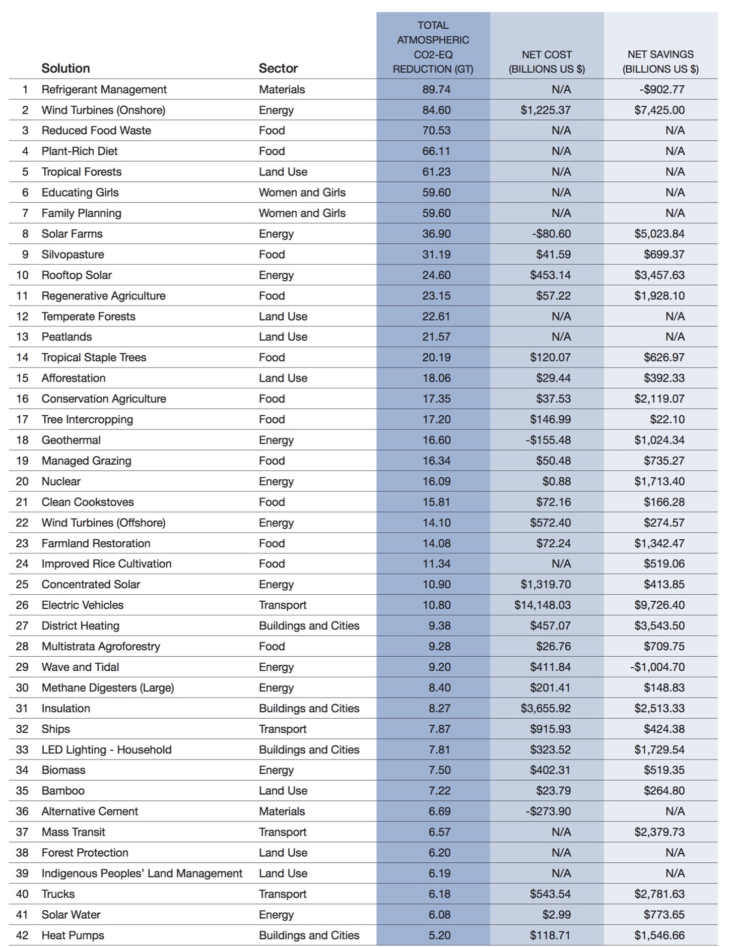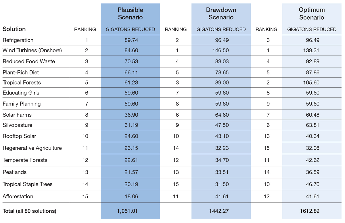 The book "Drawdown" edited by Paul Hawken has tables of Climate Change Solutions, which have been repeated below, for you to find your favorite solutions, to back with your voice.